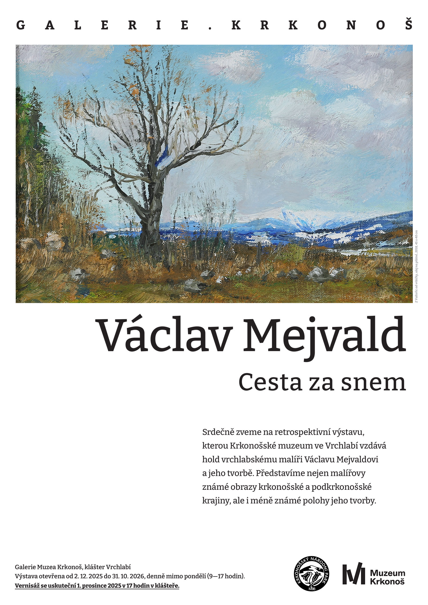 Srdečně zveme na retrospektivní výstavu, kterou Krkonošské muzeum ve Vrchlabí vzdává hold vrchlabskému malíři Václavu Mejvaldovi a jeho tvorbě. Představíme nejen malířovy známé obrazy krkonošské a podkrkonošské krajiny, ale i méně známé polohy jeho tvorby.